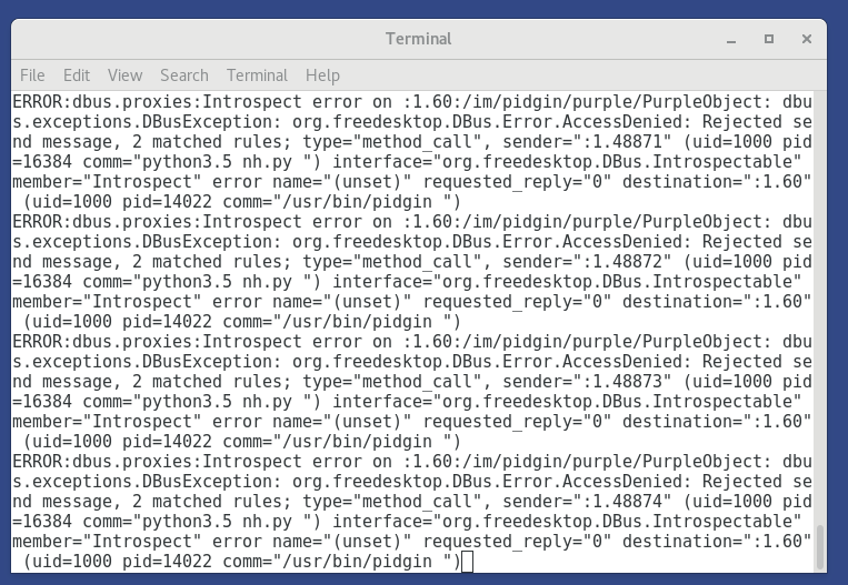 The fix for Bug #14612 has completely broken IO between application in Terminal (NH) and Pidgin. Please either re-enable DBus for Pidgin, or help me add necessary commands to installer that re-enable DBus for TFC users.